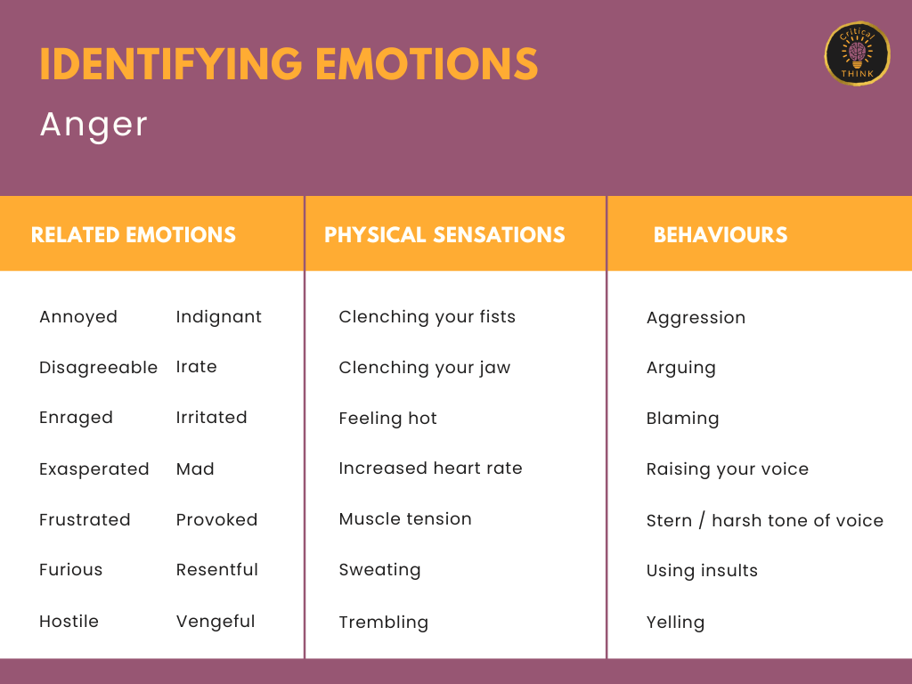 The purpose of this tool is to help people identify the emotions they are experiencing and expand their emotional vocabulary. This tool covers the seven universal emotions: anger, contempt, disgust, enjoyment, fear, sadness, and surprise. For each of the seven emotions, a list of related emotions is provided, along with examples of physical sensations and behaviours that accompany the emotion.