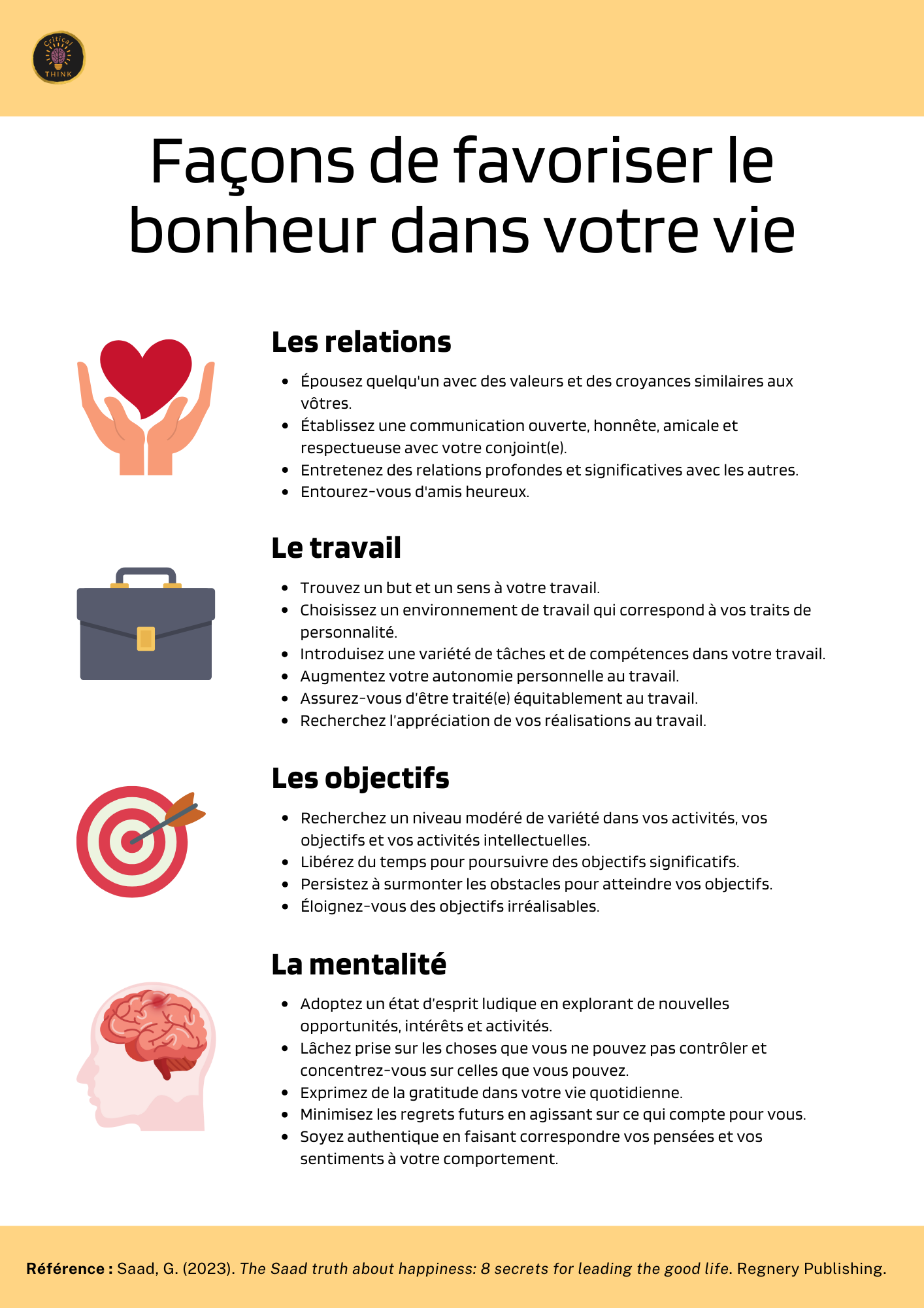 Cet outil résume les recherches sur le bonheur présentées dans le livre « La vérité sûre sur le bonheur ». Il présente certains des facteurs les plus importants liés à un bonheur accru.