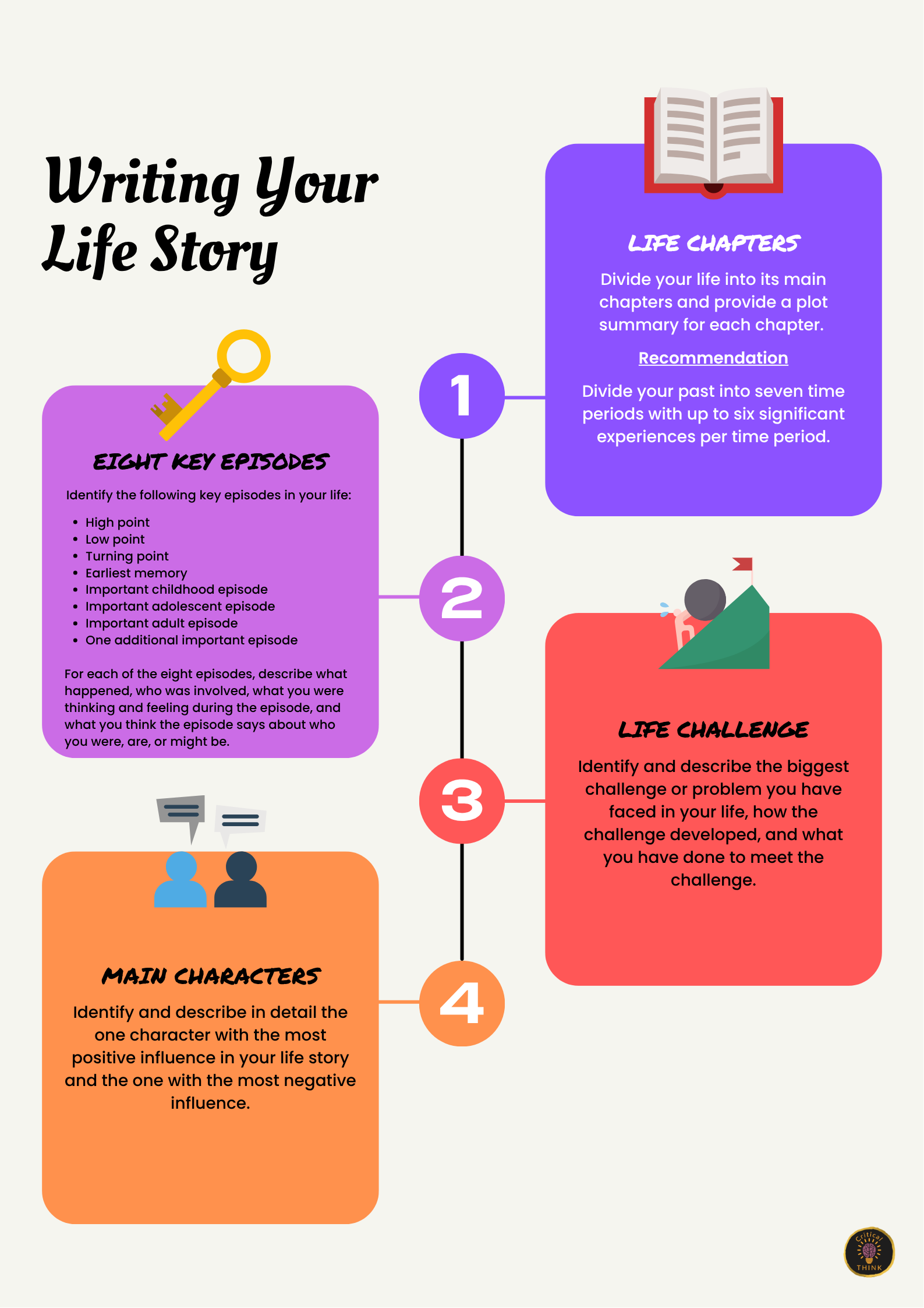 This two-page tool provides you with a structured process that you can follow to write your life story. According to Dan P. McAdams' three-level model of personality and narrative identity, our life story represents the third level of personality and provides us with a sense of unity, meaning, and purpose in life.